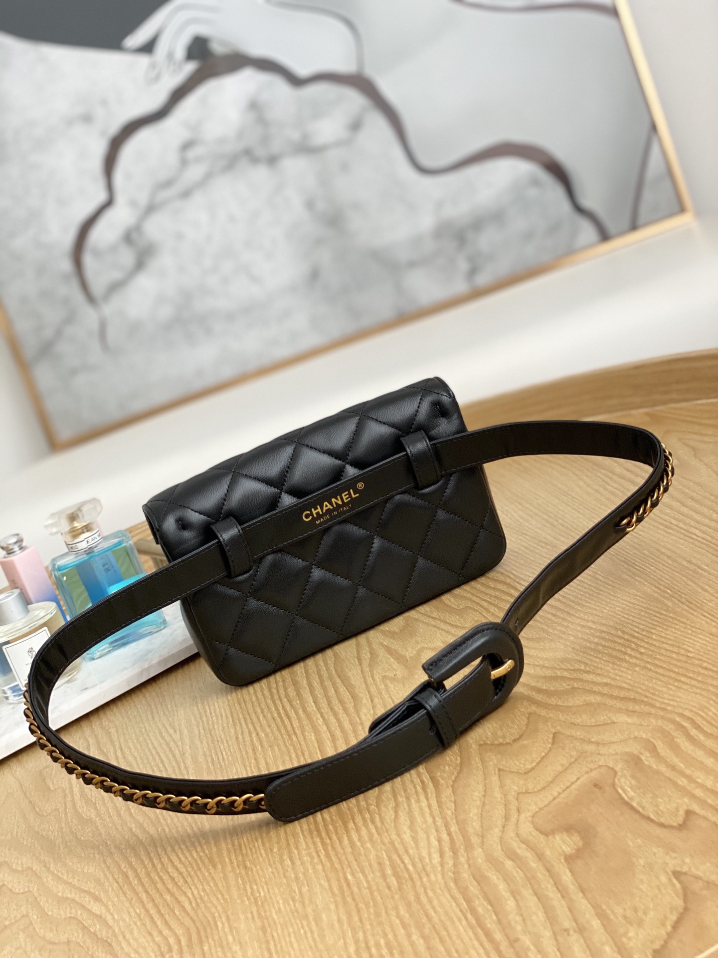 Elevate your style with this Chanel belt bag. Crafted in lambskin leather with iconic quilting and gold-tone hardware.