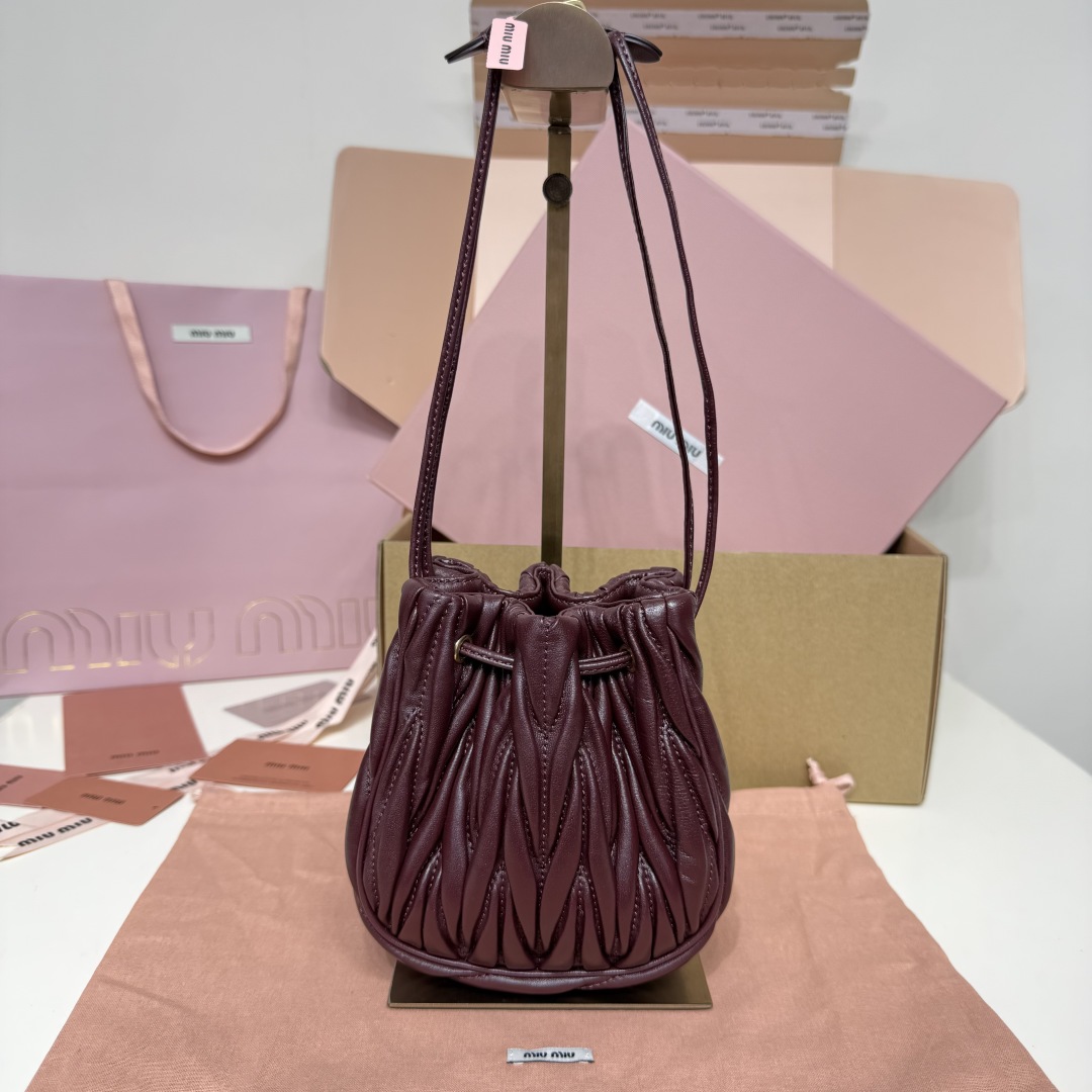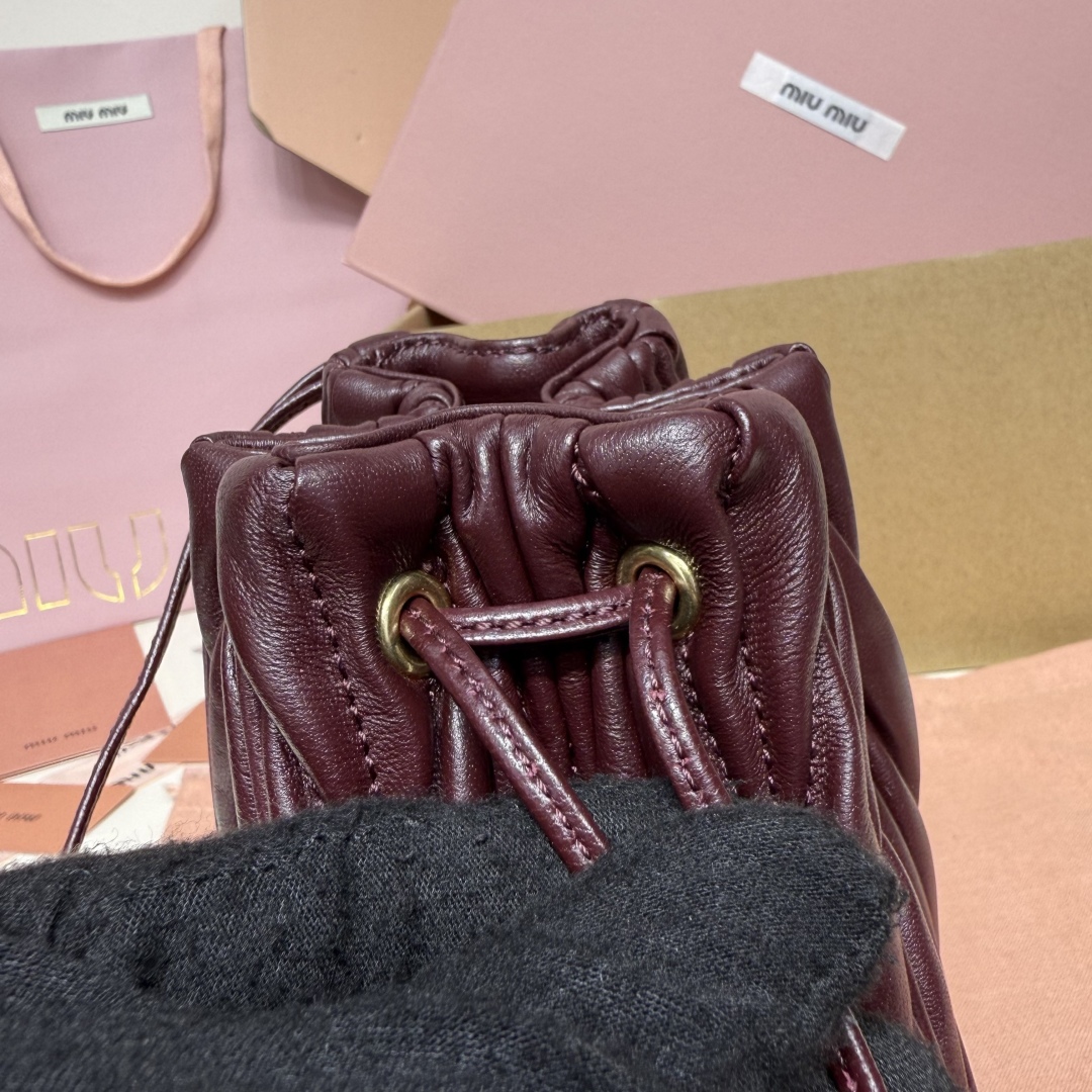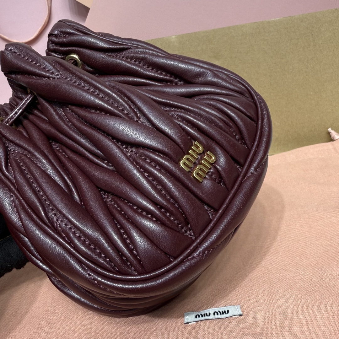 Tags: Designer Bucket Bag, Drawstring Shoulder Bag, Luxury Leather Handbag, Matelassé Wine Leather Bag, miu miu bucket bag