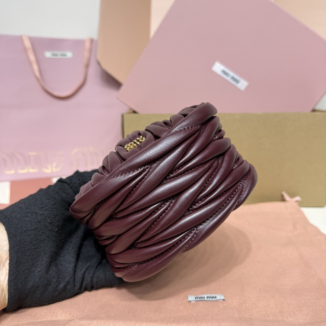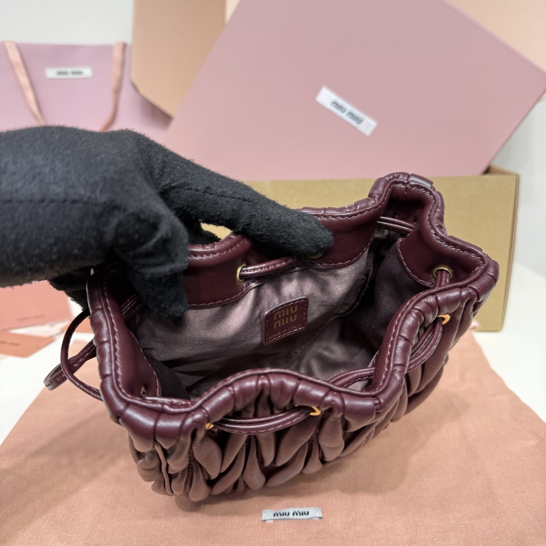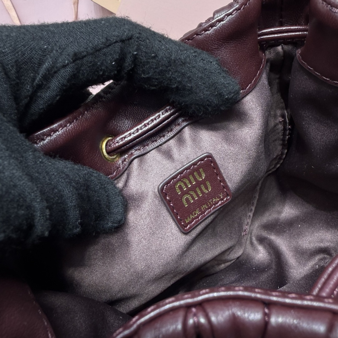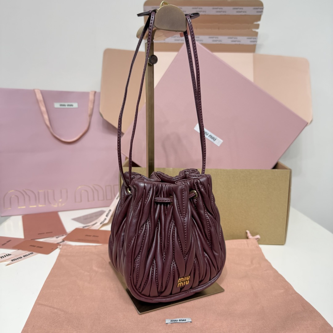Tags: Designer Bucket Bag, Drawstring Shoulder Bag, Luxury Leather Handbag, Matelassé Wine Leather Bag, miu miu bucket bag