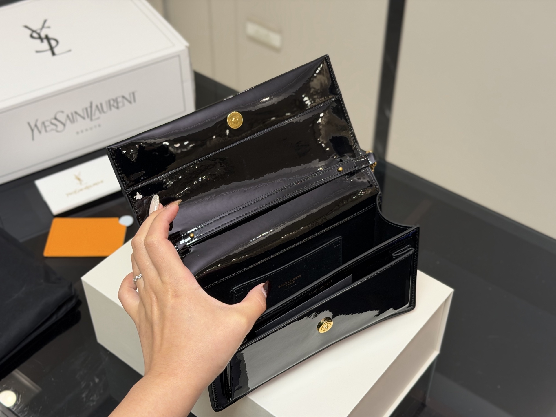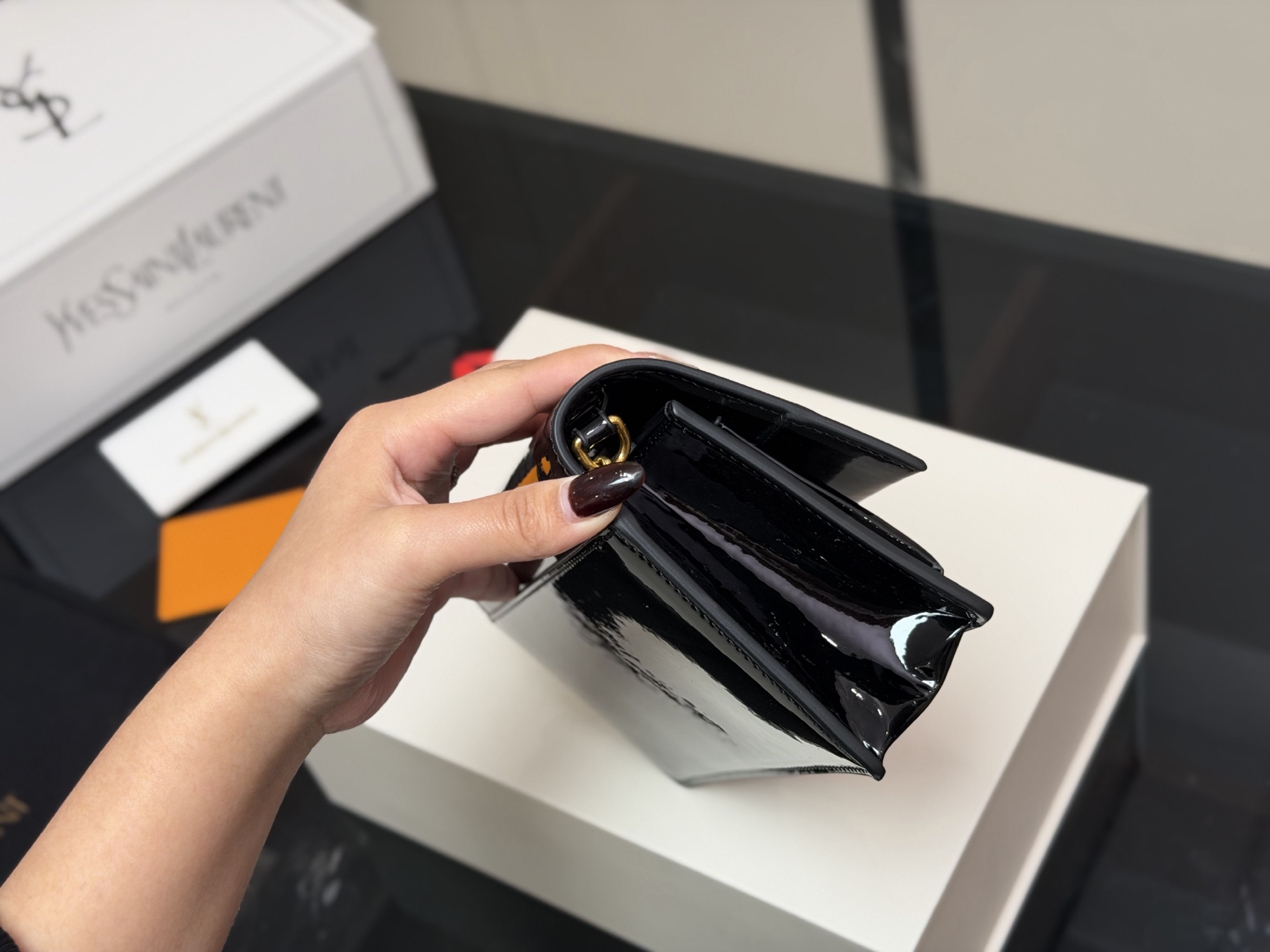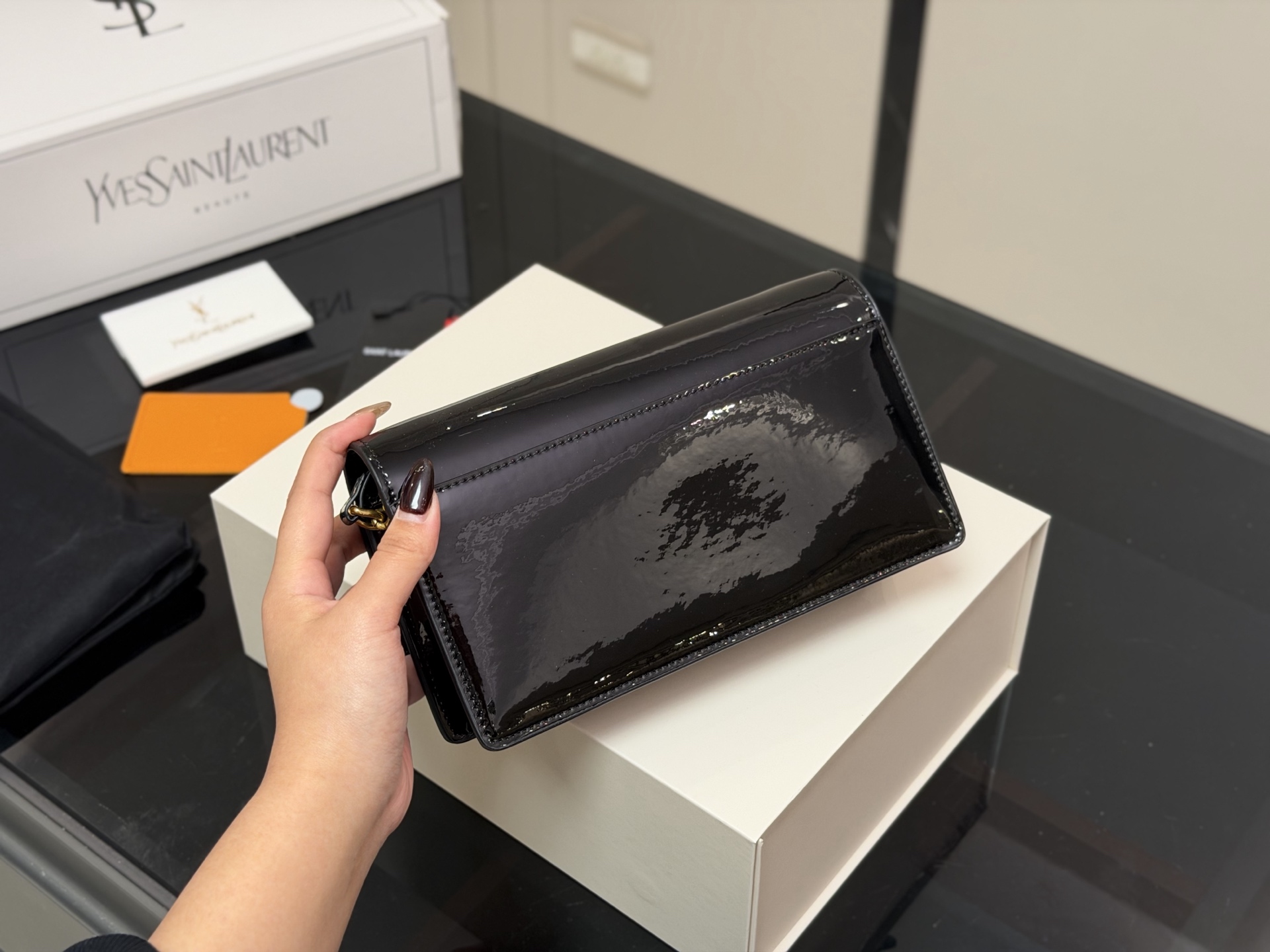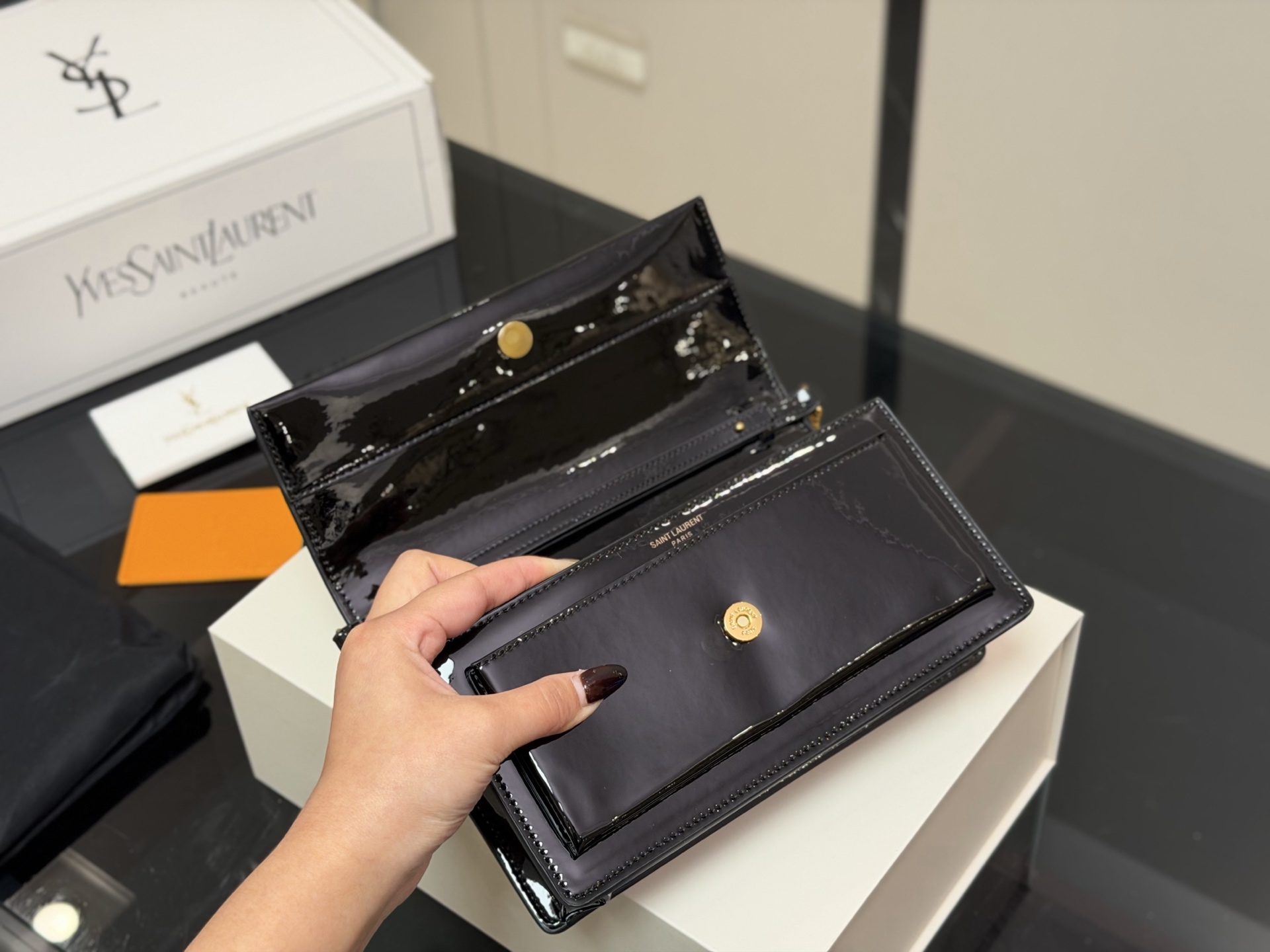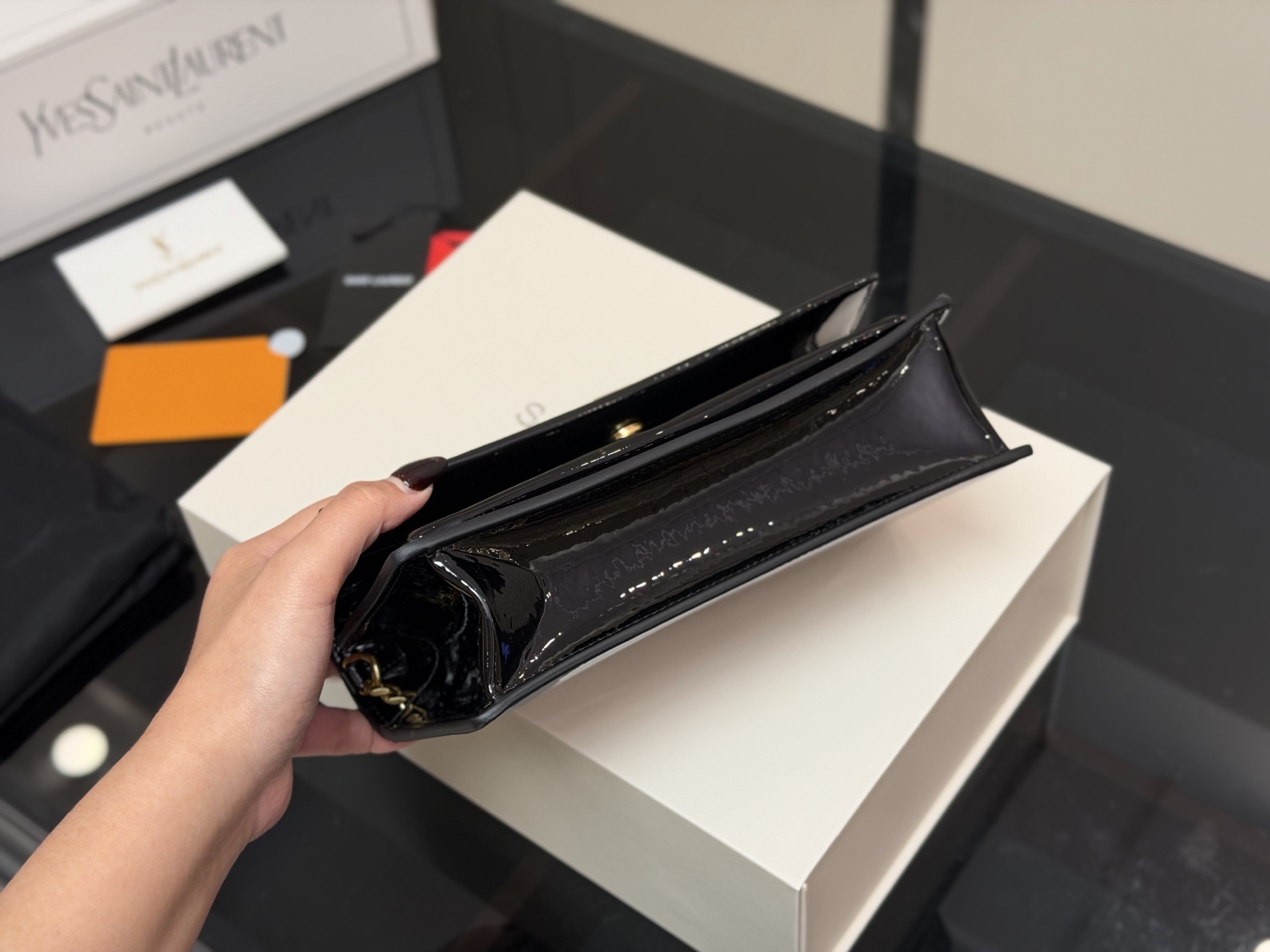 The Yves Saint Laurent Sunset bag in black patent leather with gold hardware. A timeless and elegant accessory for any occasion. Size: 22cm.