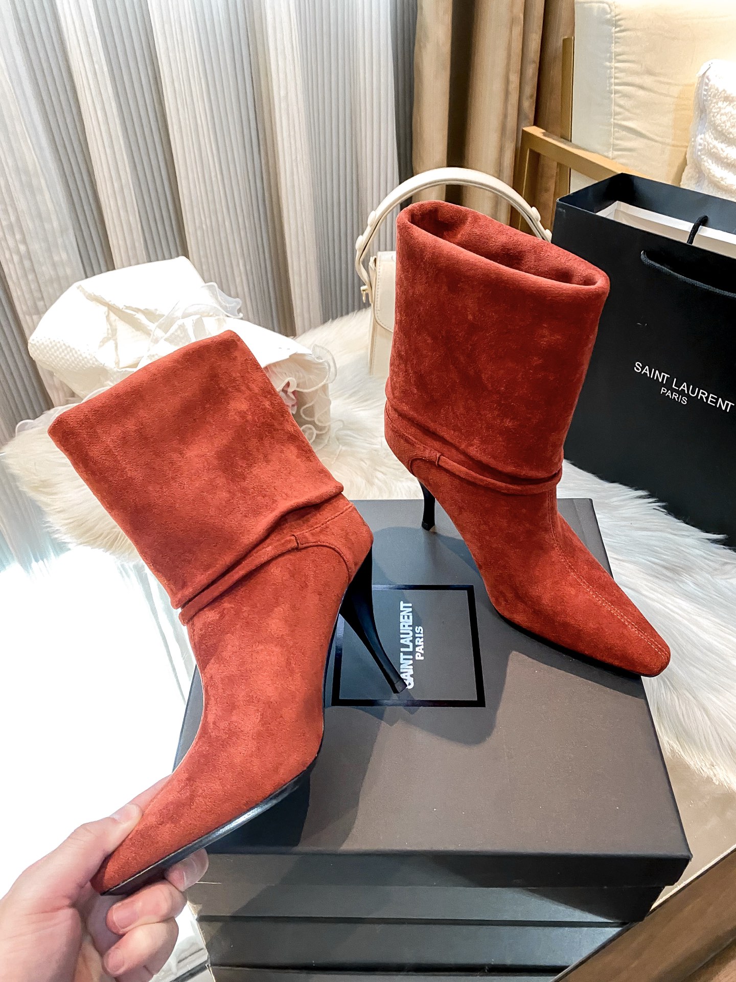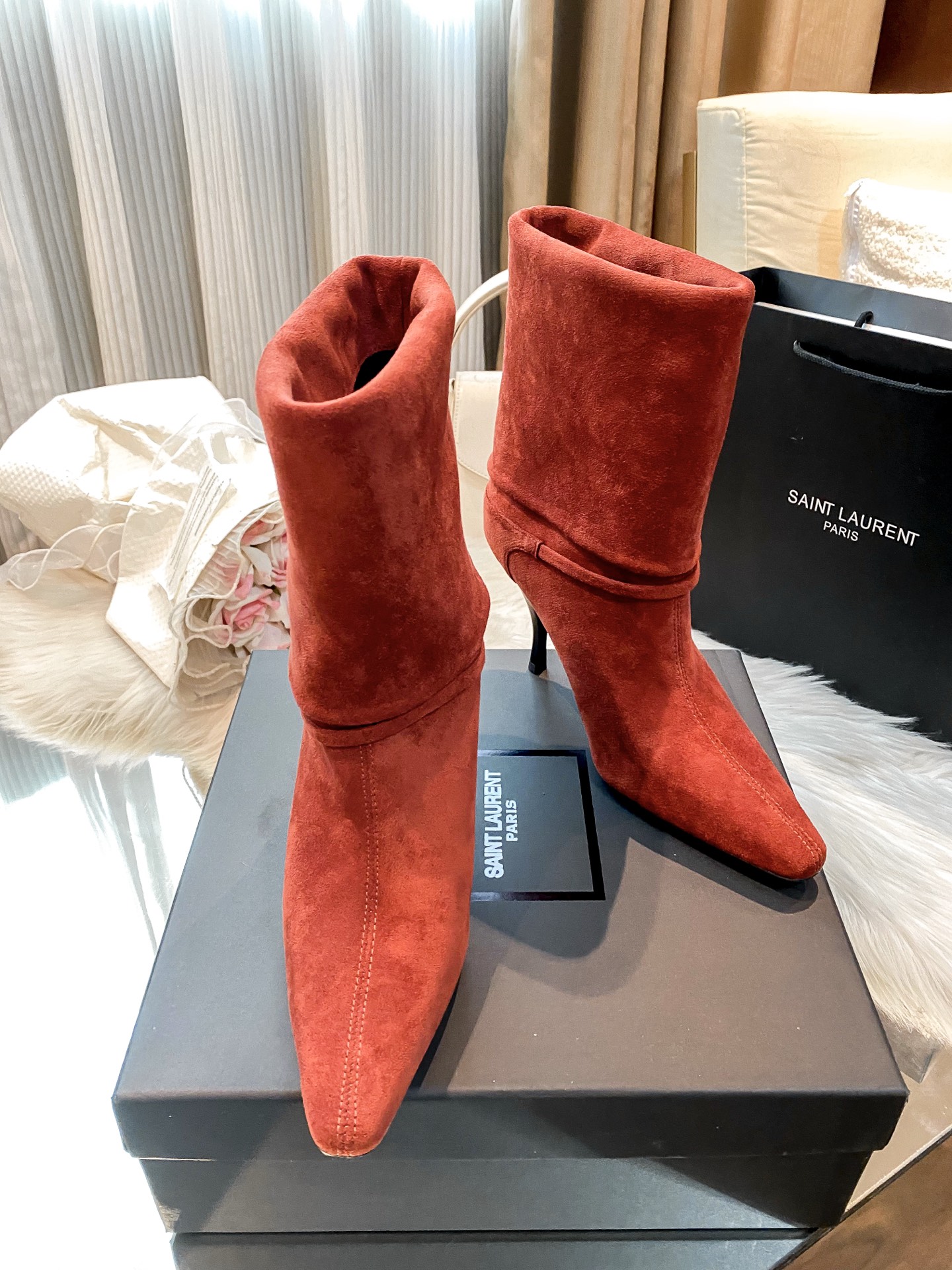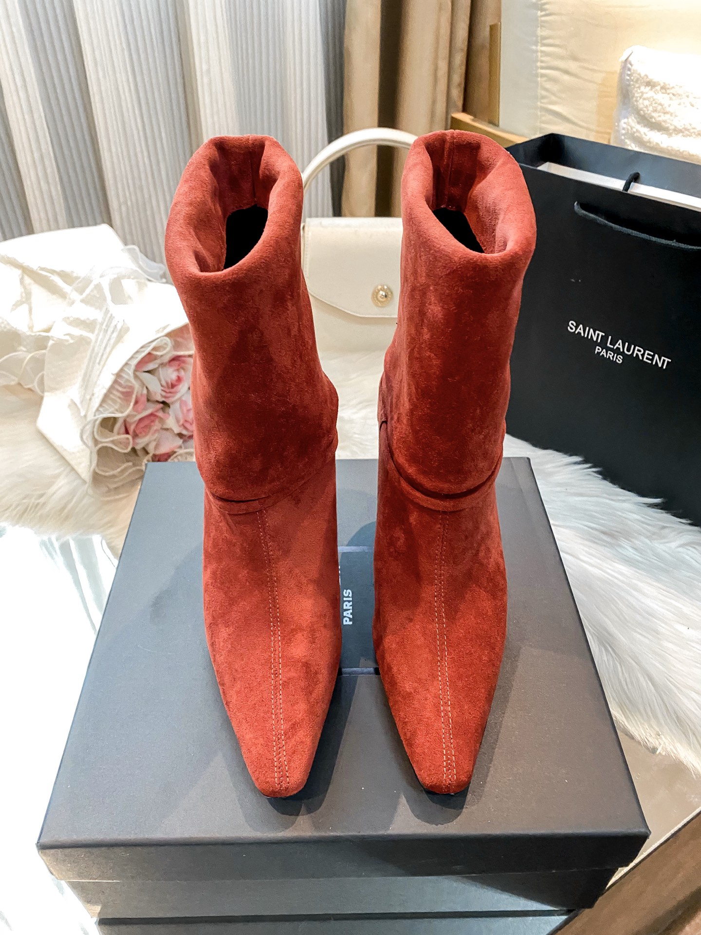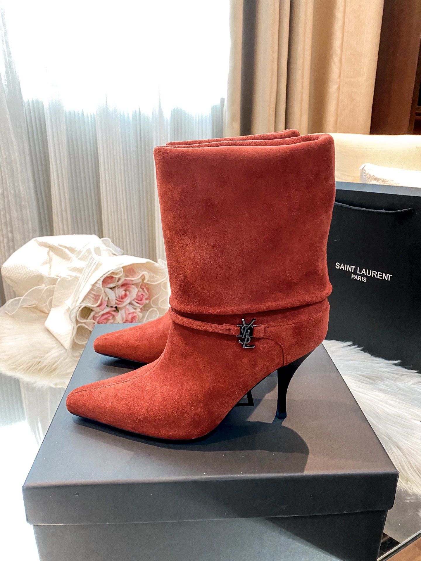 Tags: Designer Heel Boots, Pointed Toe Booties, Red Suede Boots, Suede Ankle Boots, Women's Fashion Boots, Yves Saint Laurent Boots