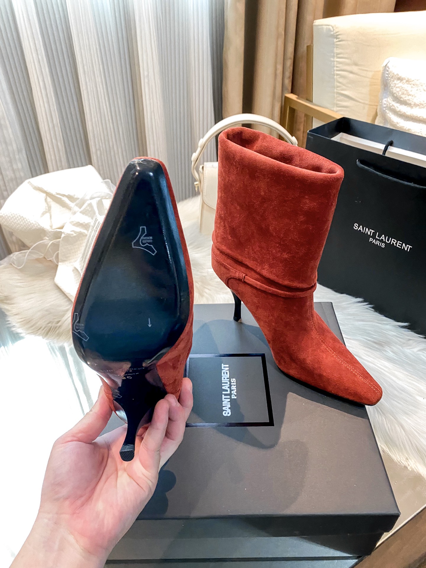 Step out in style with these YSL suede ankle boots. Featuring a sleek pointed toe and comfortable heel, perfect for elevating any outfit.