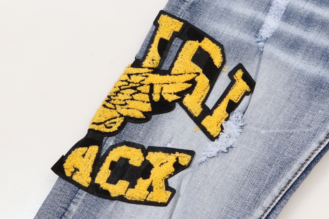 Elevate your style with these Amiri denim jeans. Featuring an embroidered wing design, distressed details, and a slim fit for a modern, edgy look.