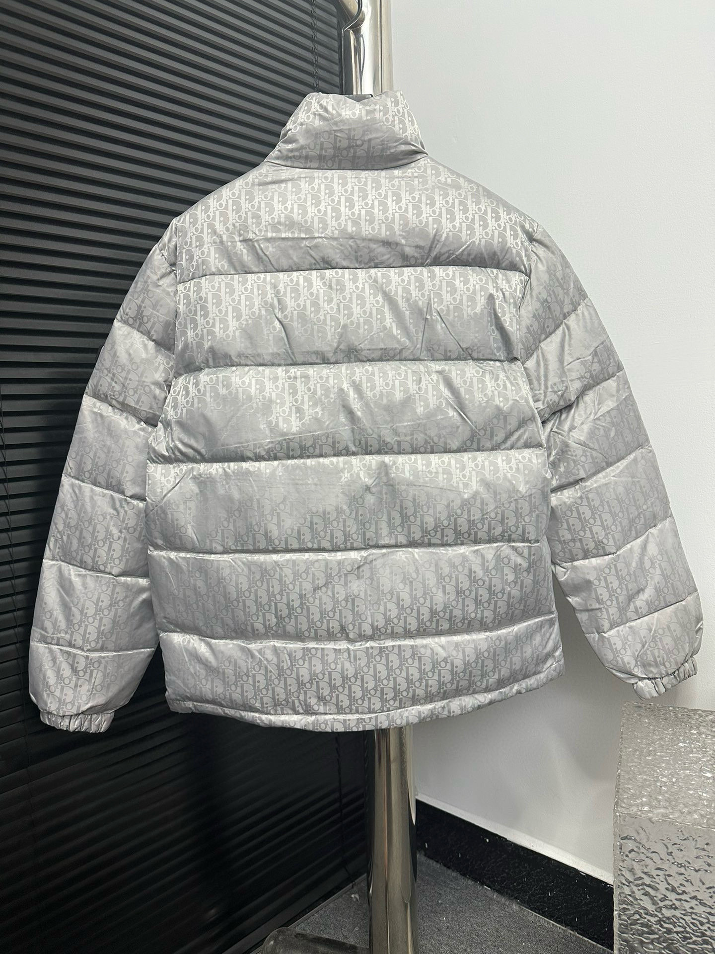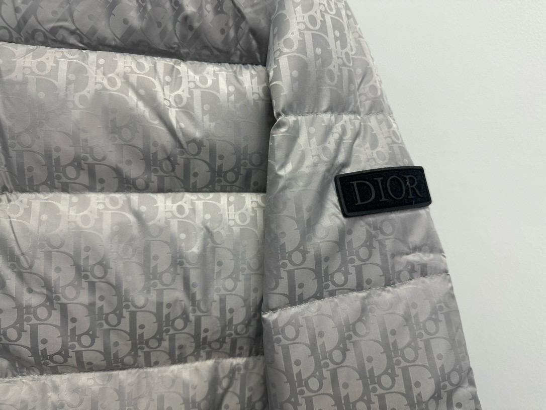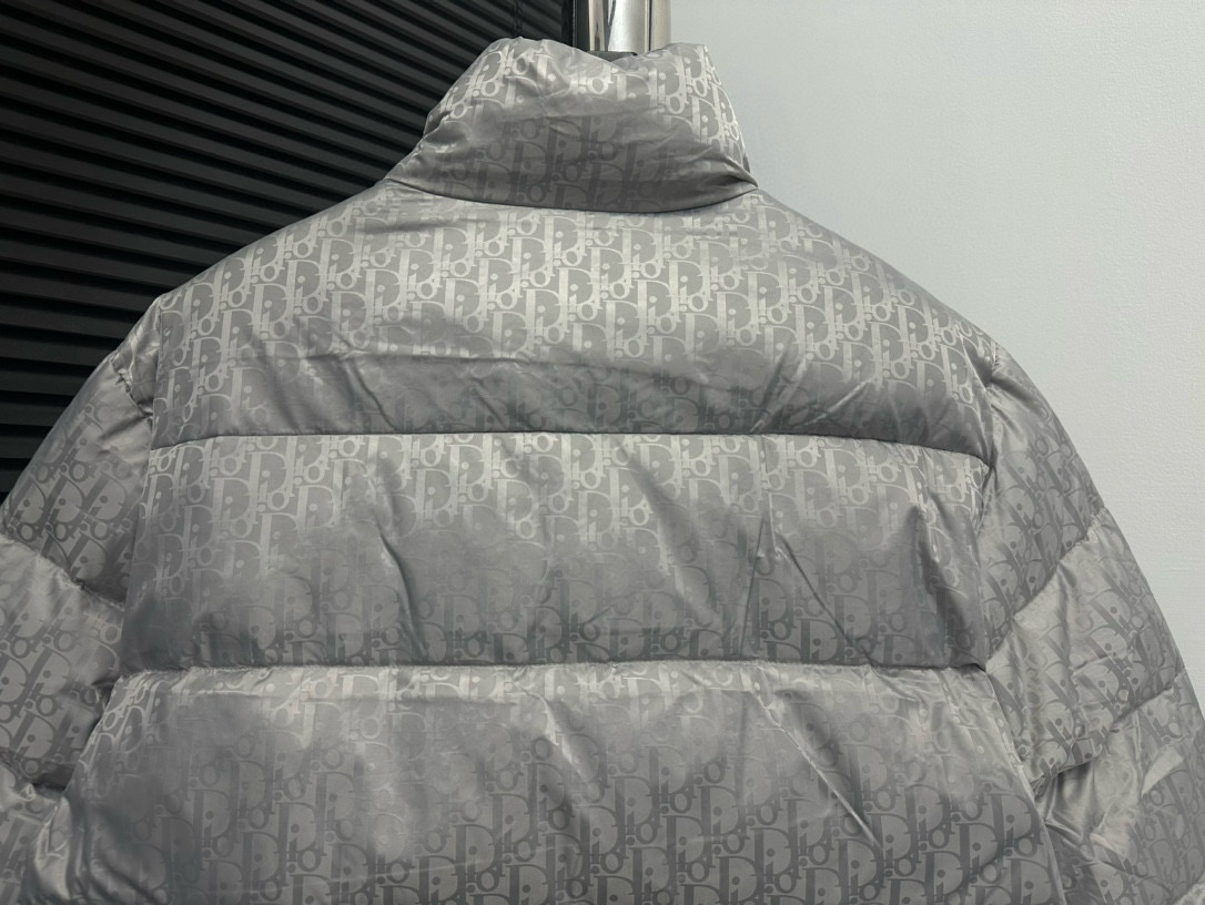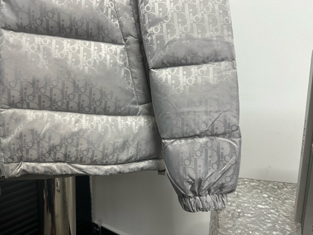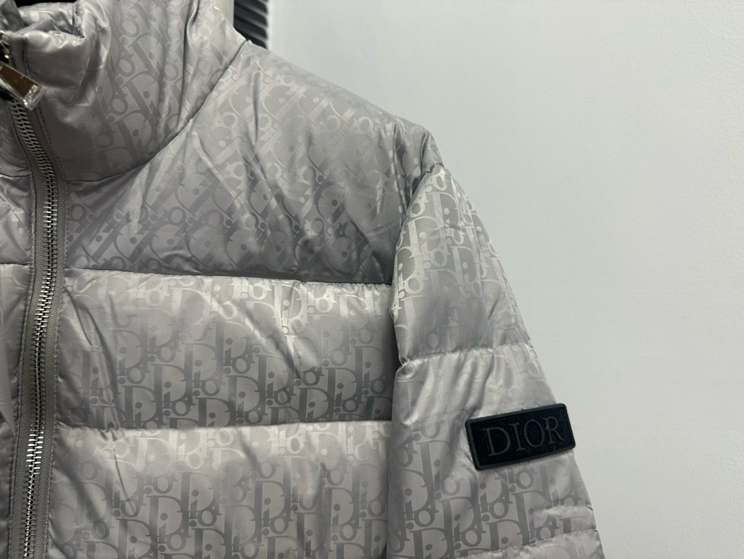 Tags: Designer Puffer Jacket, Dior Down Jacket, Jacquard Padded Coat, Luxury Outerwear, Silver Gray Jacket