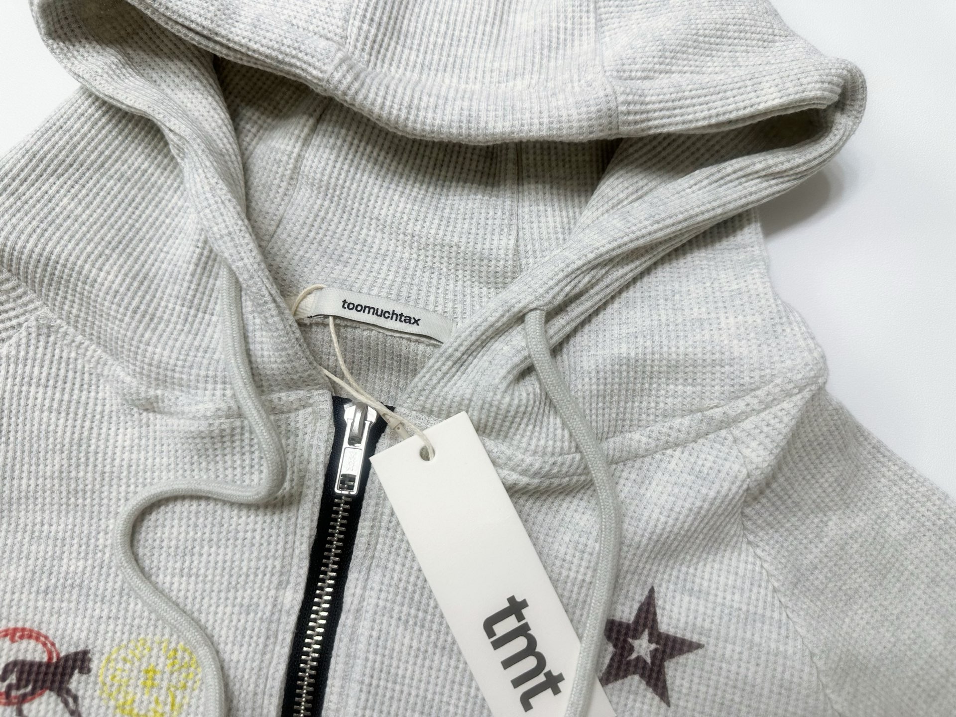 Elevate your fall style with this Toomuchtax zip-up hoodie. Features a unique graphic print on cozy waffle fabric. Unisex fit for ultimate comfort.