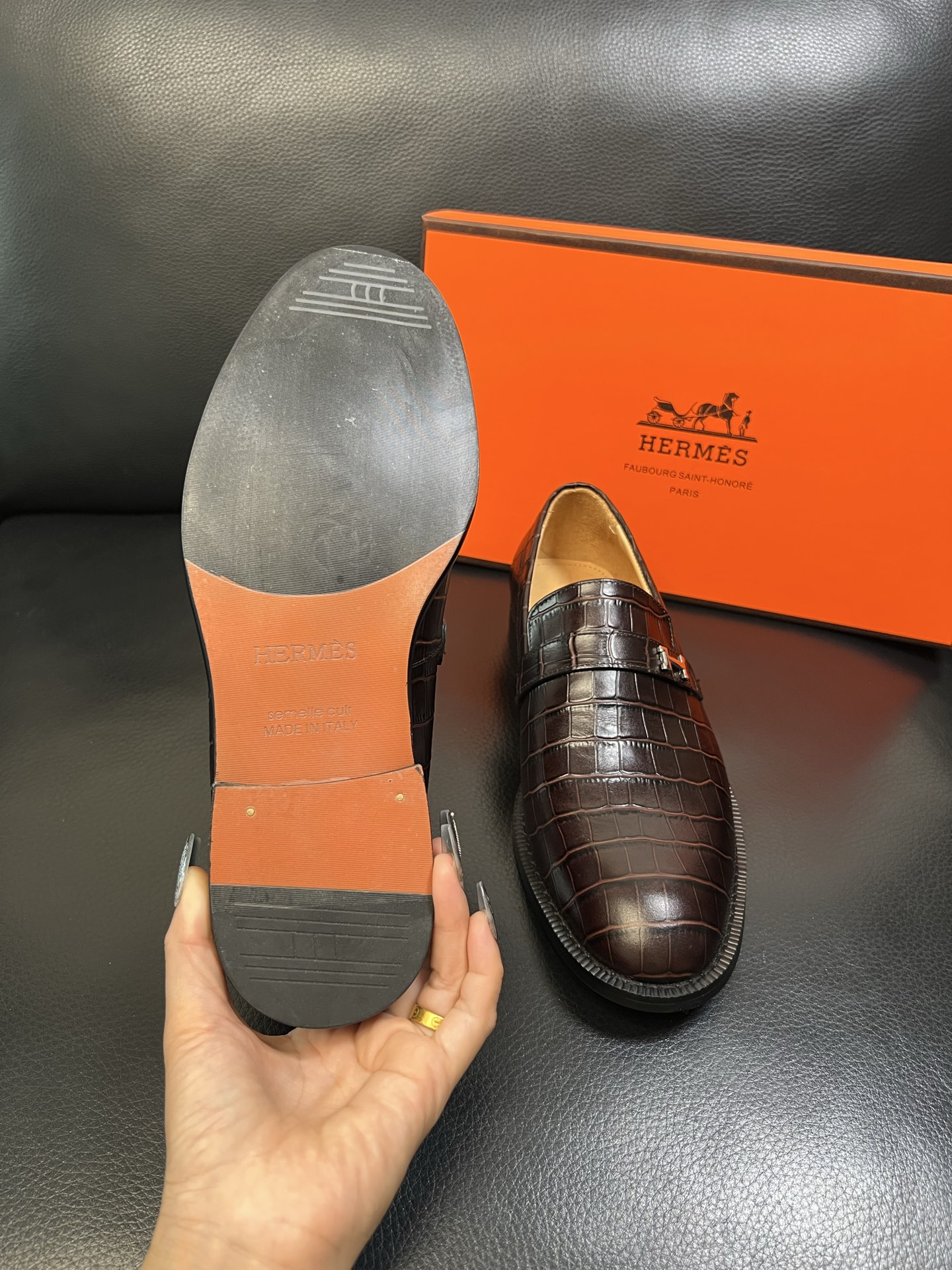 Tags: Alligator Leather Loafers, Brown Leather Shoes, H Buckle Loafers, Luxury Dress Shoes, Men's Leather Slip Ons