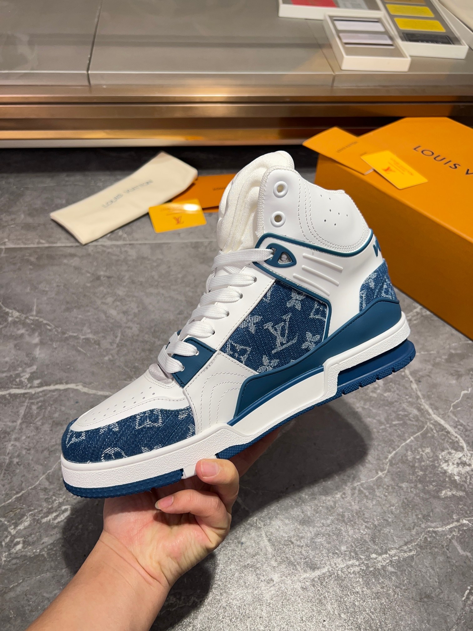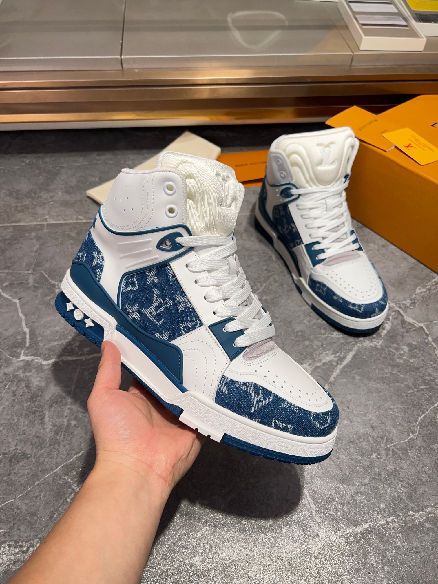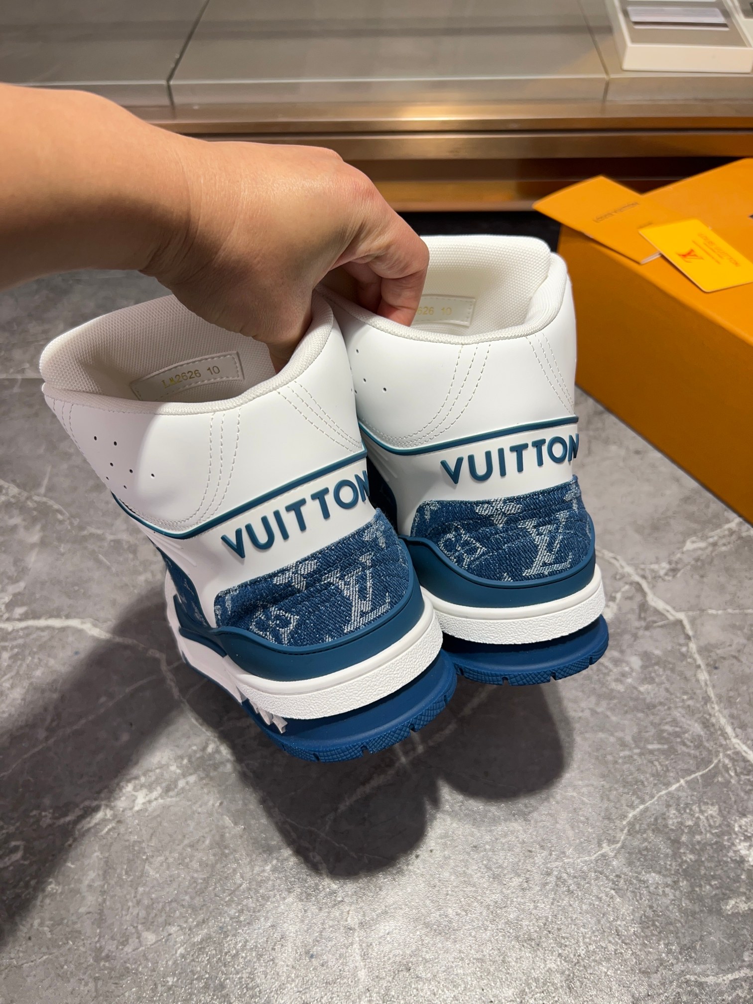 These Louis Vuitton high-top sneakers are a blend of luxury and casual style, perfect for the modern man.